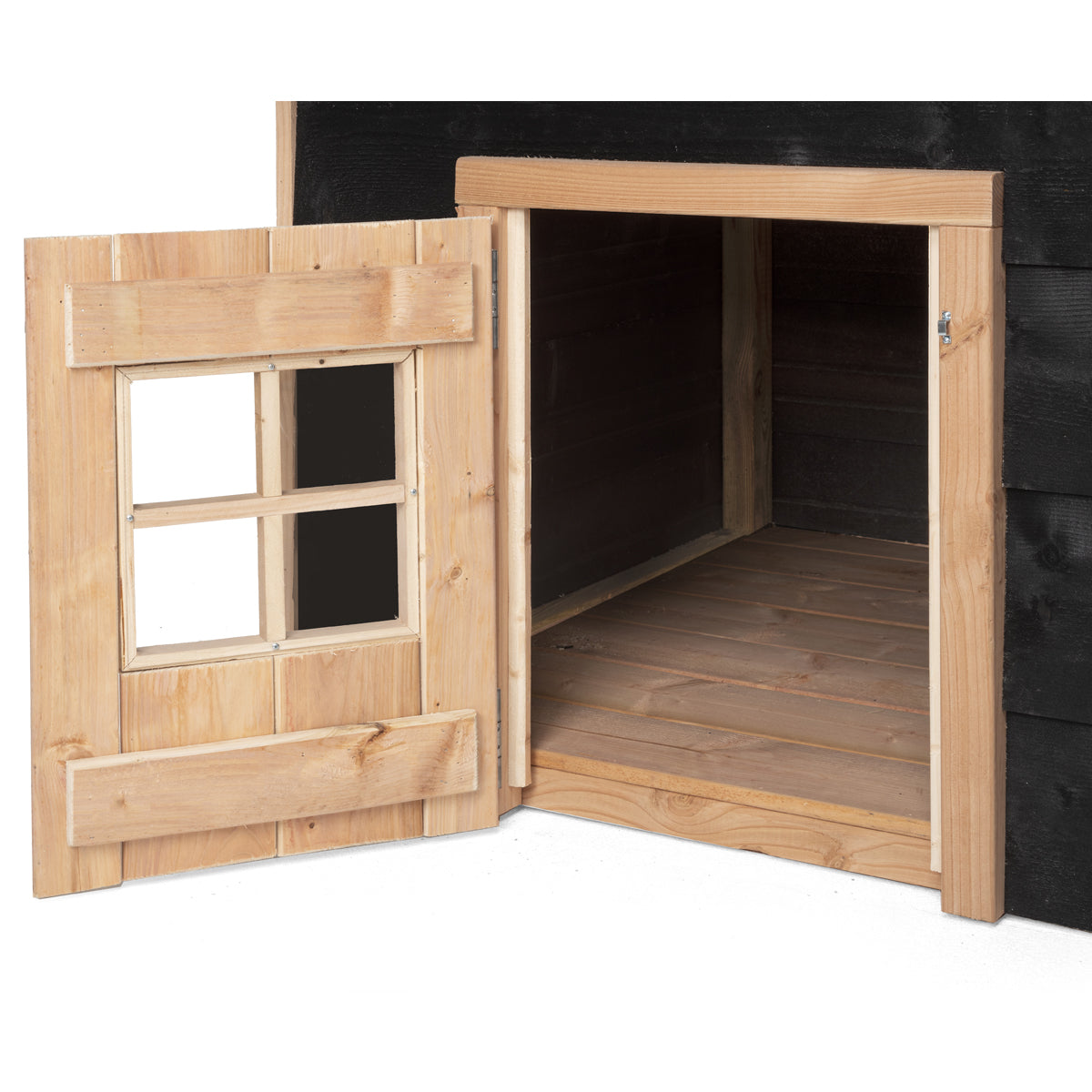 Dit prachtige zwarte hondenhok heeft een buitenafmeting van (B) 201 x (D) 113 x (H) 110 cm. Het buitenhok voor honden biedt een afgeschermd nachtgedeelte van (B) 100 x (D) 100 cm en heeft een aangrenzende veranda van bijna 1 vierkante meter, perfect voor fijne dutjes in de zon. Het nachthok heeft een vrije doorgang voor de hond met een afmeting van (B) 40 x (H) 60 cm. Zelf kun je ook eenvoudig toegang krijgen tot het verblijf door het toegangsdeurtje aan de voorzijde van het hondenhok. Dit scharnierend deurtje is afsluitbaar en voorzien van een plexiglas ruitje voor meer daglicht in het verblijf.